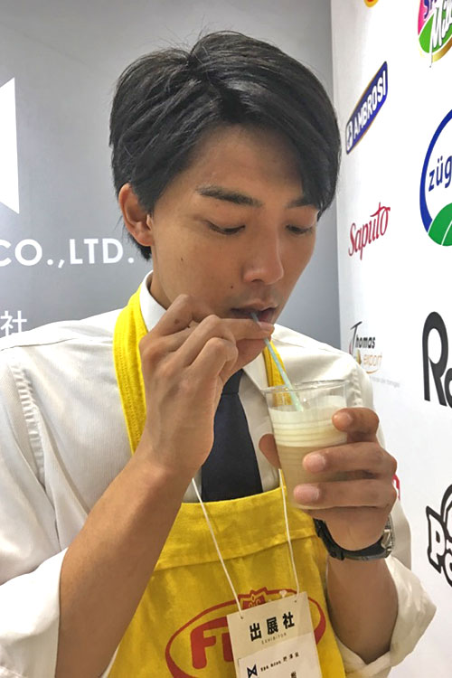 ブースを訪れたお客様に商品の説明をすることがこの研修のミッションの1つです。今年の野澤組のメイン商材は"チーズティー"であり、商品知識がないことにはお客様に勧めることができませんので、まずは実際に試飲し、その美味しさや魅力をお伝えすることに2人も挑戦しました。
