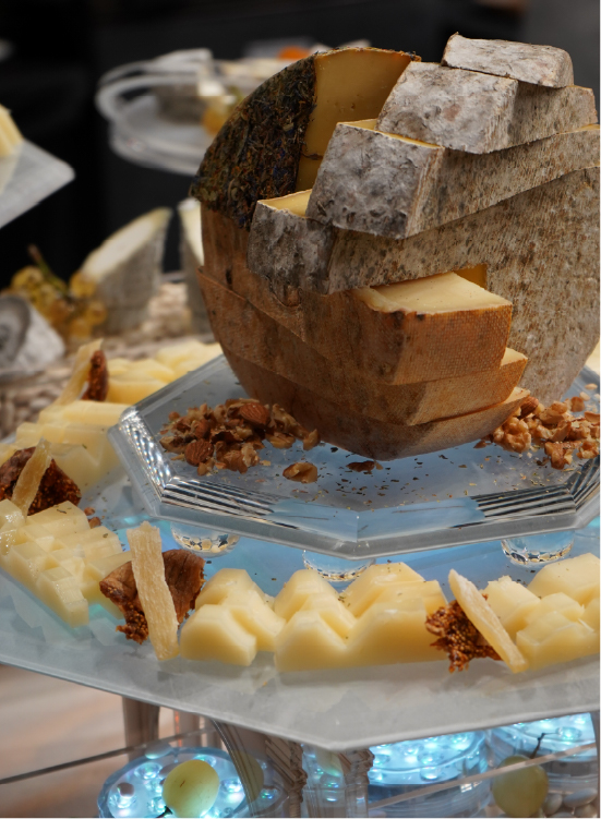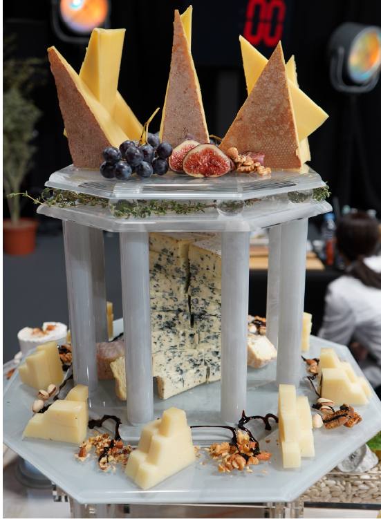なかでも注目を集めたのが「チーズプラトー制作」です。選手たちはスポンサー企業から提供された約50種類のチーズを使い、制限時間内にテーマに沿った作品を仕上げます。テーマは「Camaïeu de couleurs(色のカマイユ)」。当社社員の作品は、同一色系のグラデーションを軸に、下から上へ白色から黄色へと移り変わる構成とし、発酵の神秘性をパルテノン神殿風のデザインで表現。美しさと創造性を兼ね備えた作品に仕上げました。