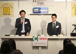 サブステージでは昨年に引き続きオランダのFricoブランドとイタリアのAmbrosi社の紹介をさせて頂きました。Frico紹介コーナーでは、ゴーダマイルド(通常熟成タイプ)、オールドダッチマスター(ゴーダ1年熟成)、ゴーダマスタード(マスタードが練りこんであるゴーダチーズ)の3種をご提供し、ご来場の皆様に食べ比べていただきました。非常に熱心に説明を聞いてくださり、お客様のチーズに対する興味や情熱が伝わってきました。