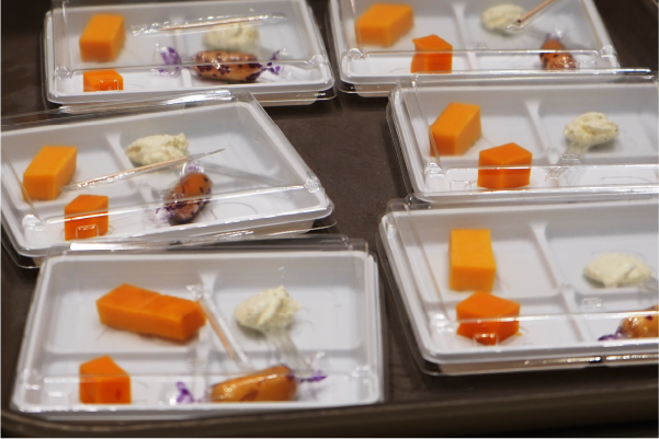 私が試食したタイミングでは、ドライフルーツ入りのクリームチーズと、やさしいミルク感のブリーにほのかに青カビを混ぜ込んだ小さなチーズが登場していました。