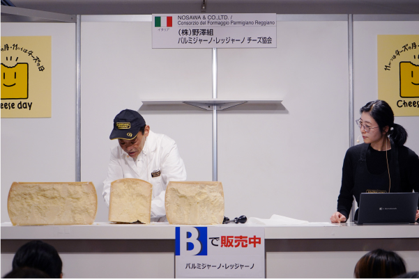 毎年恒例のパルミジャーノ・レッジャーノのカットショーも行いました。 小さなナイフだけで大きなチーズの塊に切れ目を入れ、ゆっくりと力を加えて“ぱかっ”と割っていく、あの瞬間は何度見ても感心してしまう光景です。